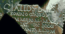 | CIALLOS B[V] IS SONNO CINGOS[] AMMAN M M XIII LAT CCC LXXXV [S]ANTARAN M | CIALLOS (im 3. Jahr-Monat 31)-Schaltmonat {G} cíall – Bedeutung, Sinn, Anlass, Grund, Einsicht, Erkenntnis, Weisheit, Klugheit (2) Irisch {I} ciallú – Erklärung, Interpretation; (12) B[V]IS: Sanskrit {S} bhūyas – mehr, größer; (10); oder Textfragment gelesen als B[I]IS: Irisch {I} bisiú (gesprochen: b'is'i:) - verbessern, steigern son - a) Grund, Anlass, Ursache; b) Präp.und Adv.: wegen, in Folge, auf Grund, weil, zum Zweck, (1);